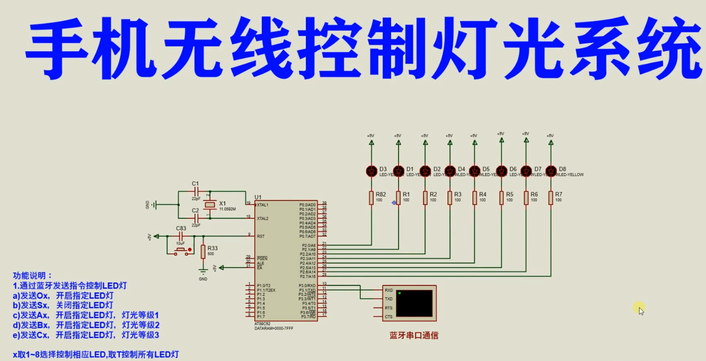 基于51单片机的手机无线控制灯光系统仿真 AT89C52是一款经典的8位单片机,是意法半导体(STMicroelectronics)公司生产的一系列单片机之一。它基于8051内核,并具有许多与其兼容的特性。AT89C52的主要特点如下:内部存储器:AT89C52具有8KB的闪存(Flash)存储器,可用于存储用户程序和数据。这些存储器的内容可以通过编程器进行编程和擦除。RAM存储器:AT89C52配备了256字节的随机存取存储器(RAM),用于暂存数据和程序的变量。