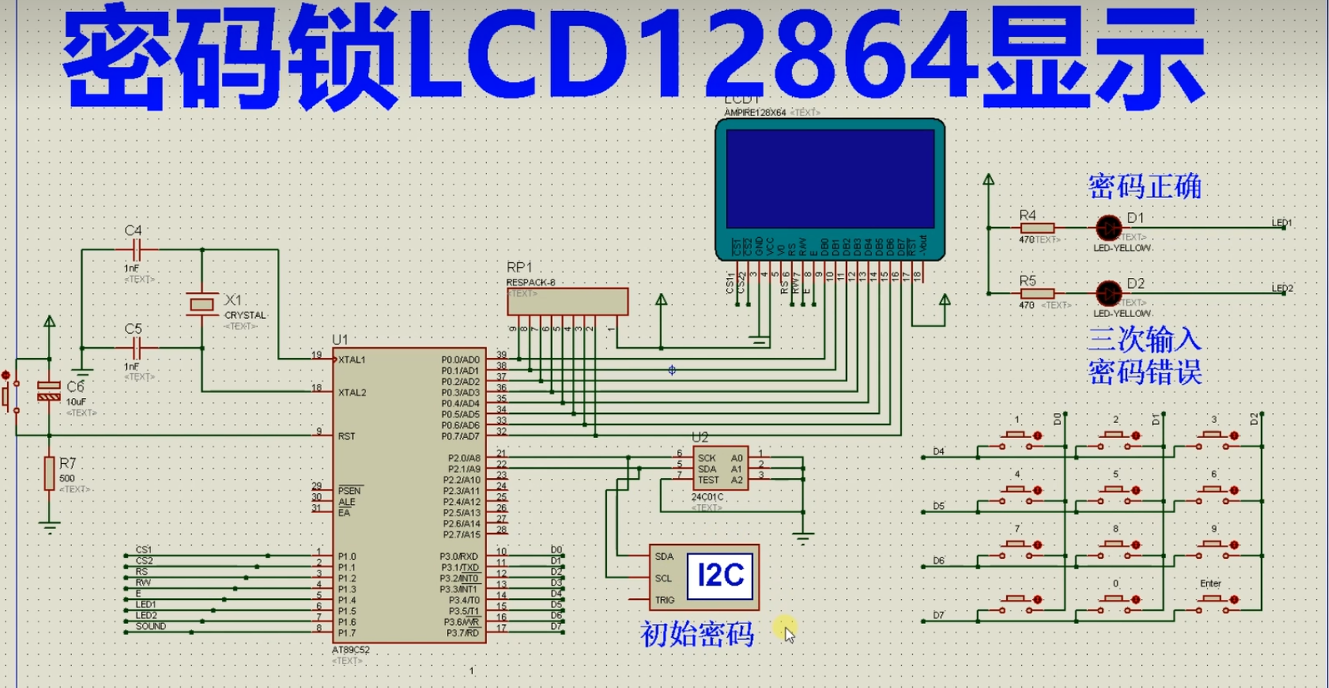 免费分享-基于51单片机的密码锁LCD12864显示仿真 AT89C52是一款经典的8位单片机,是意法半导体(STMicroelectronics)公司生产的一系列单片机之一。它基于8051内核,并具有许多与其兼容的特性。AT89C52的主要特点如下:内部存储器:AT89C52具有8KB的闪存(Flash)存储器,可用于存储用户程序和数据。这些存储器的内容可以通过编程器进行编程和擦除。RAM存储器:AT89C52配备了256字节的随机存取存储器(RAM),用于暂存数据和程序的变量。