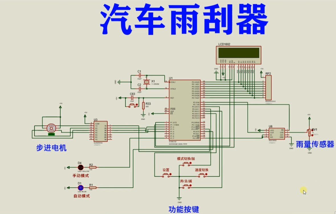基于51单片机的汽车雨刮器仿真 AT89C52是一款经典的8位单片机,是意法半导体(STMicroelectronics)公司生产的一系列单片机之一。它基于8051内核,并具有许多与其兼容的特性。AT89C52的主要特点如下:内部存储器:AT89C52具有8KB的闪存(Flash)存储器,可用于存储用户程序和数据。这些存储器的内容可以通过编程器进行编程和擦除。RAM存储器:AT89C52配备了256字节的随机存取存储器(RAM),用于暂存数据和程序的变量。