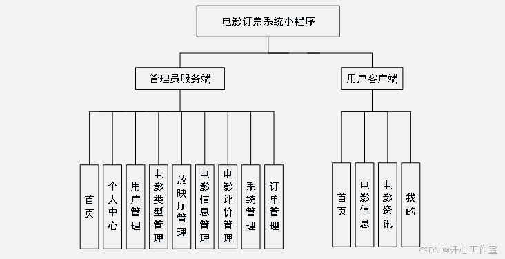 系统功能设计是在系统开发和设计思想的总体任务的基础上完成的。该系统的主要任务是实现电影订票系统小程序管理,使用户可以通过指令完成整个电影订票系统小程序的操作。