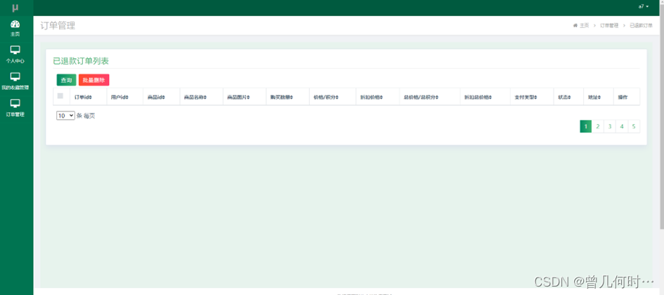 已退款订单列表:通过列表可以获取订单id、用户id、商品id、商品名称、商品图片、购买数量、价格/积分、折扣价格、总价格/总积分、折扣总价格、支付类型、状态、地址等信息,进行查看、删除操作