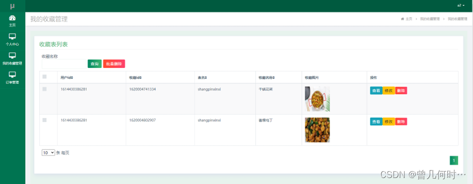 用户点击进入到系统操作界面,可以对主页、个人中心、我的收藏管理、订单管理等功能模块,我的收藏管理:通过列表可以获取用户ID、收藏ID、表名、收藏名称、收藏图片信息并进行修改操作