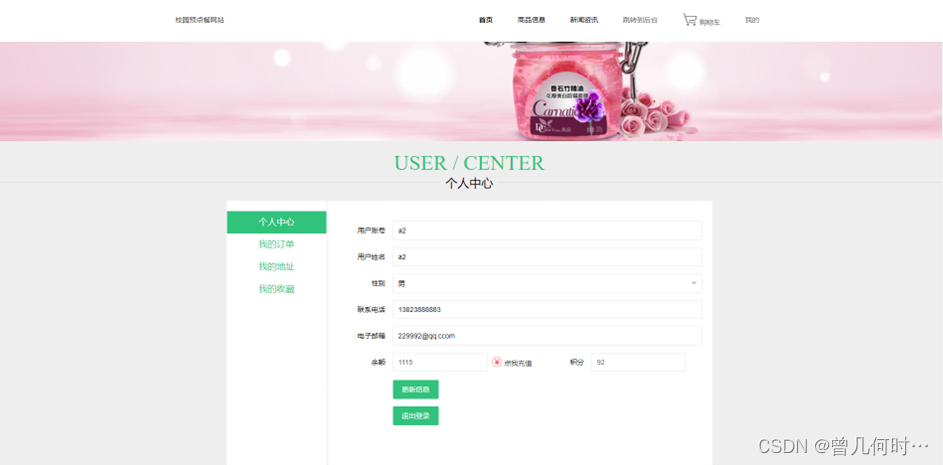 个人中心,在个人中心页面可以查看用户账号、用户姓名、密码、性别、联系电话、电子邮箱等