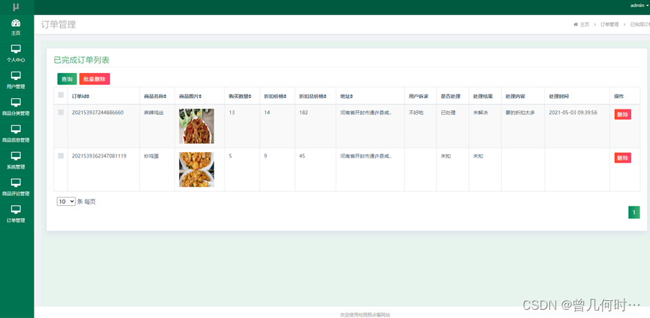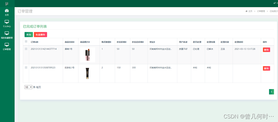 已完成订单:管理员通过列表可以获取订单id、用户id、商品id、商品名称、商品图片、购买数量、价格/积分、折扣价格、总价格/总积分、折扣总价格、支付类型、状态、地址等信息,进行修改或删除操作