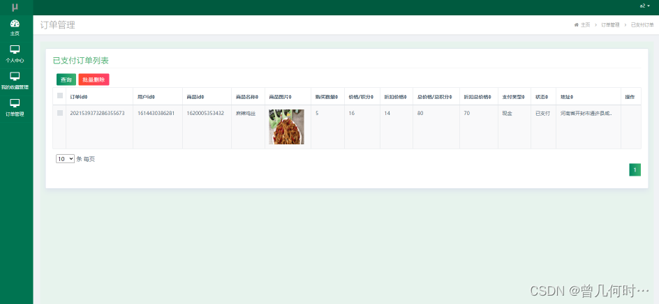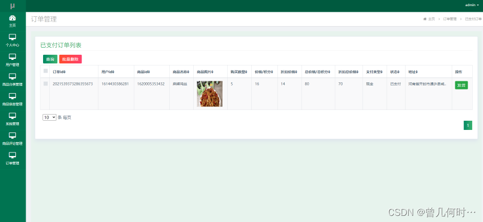 已支付订单列表:管理员通过列表可以获取订单id、用户id、商品id、商品名称、商品图片、购买数量、价格/积分、折扣价格、总价格/总积分、折扣总价格、支付类型、