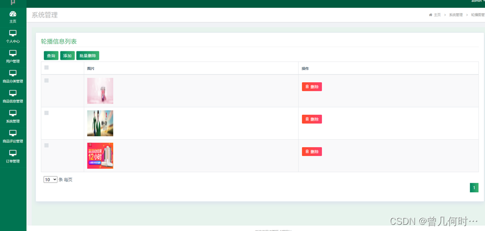 轮播图;该页面为轮播图管理界面。管理员可以在此页面进行首页轮播图的管理,通过新建操作可在轮播图中加入新的图片,还可以对以上传的图片进行修改操作,以及图片的删除操作