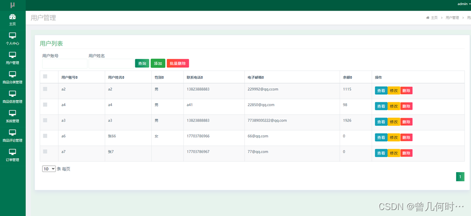 用户管理:通过列表可以获取用户账号、用户姓名、密码、性别、联系电话、电子邮箱、余额等信息,进行修改或删除操作