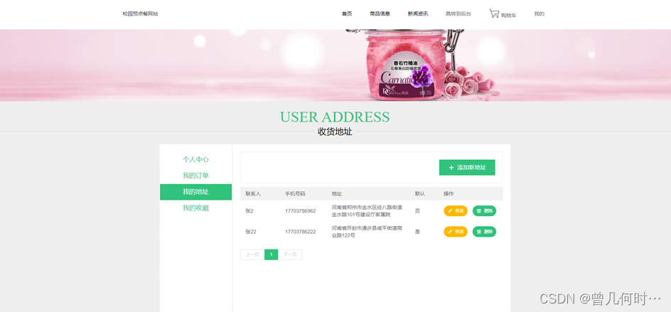 收货地址添加,在收货地址添加页面可以查看个人中心、我的订单、我的地址、我的收藏等