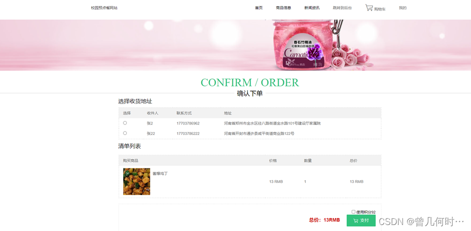 确认下单,在确认下单页面可以查看选择收货地址、清单列表等信息进行支付