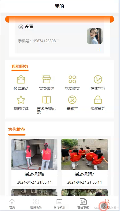 我的信息页面有登录的用户的报名活动、党费缴纳、党费收支、在线学习等内容