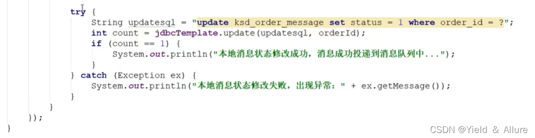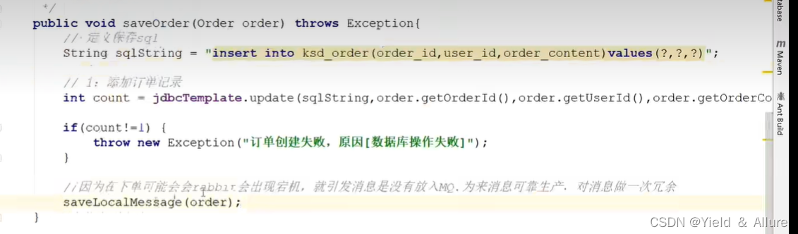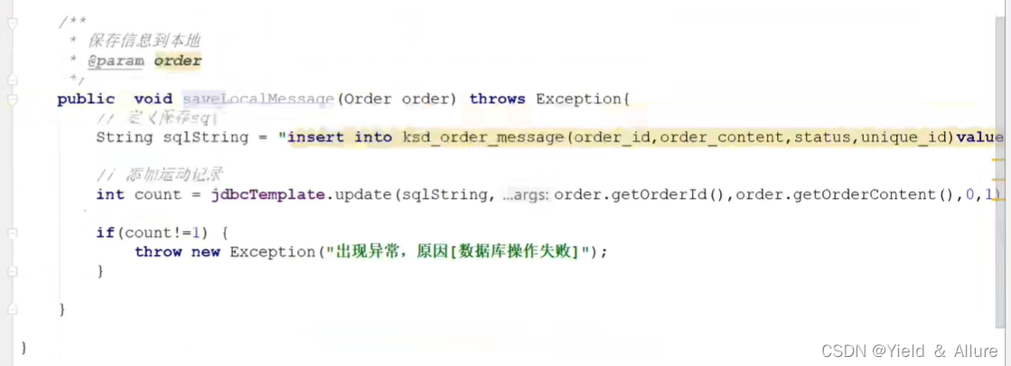 在OrderDataBaseService服务中,添加一个saveLocalMessage()方法,是用来记录消息是否发送,通过status这个字段判断