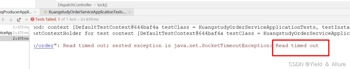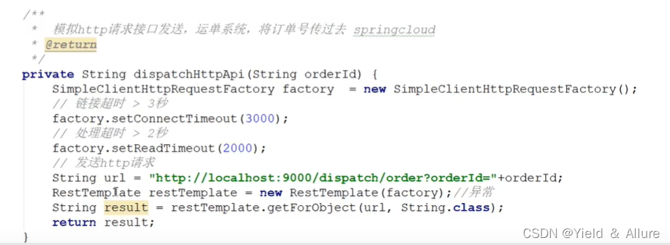 模拟分布式事务问题:在订单模块OrderService里面的dispatchHttpApi()方法中使用RestTemplate远程调用接口,这里模拟一个连接超时的错误,定义的是连接时间不能超过3秒