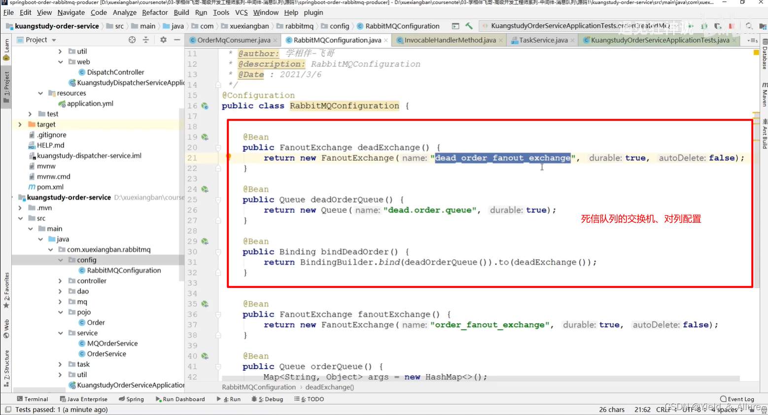 在订单服务里面配置rabbitmq的信息,配置死信队列