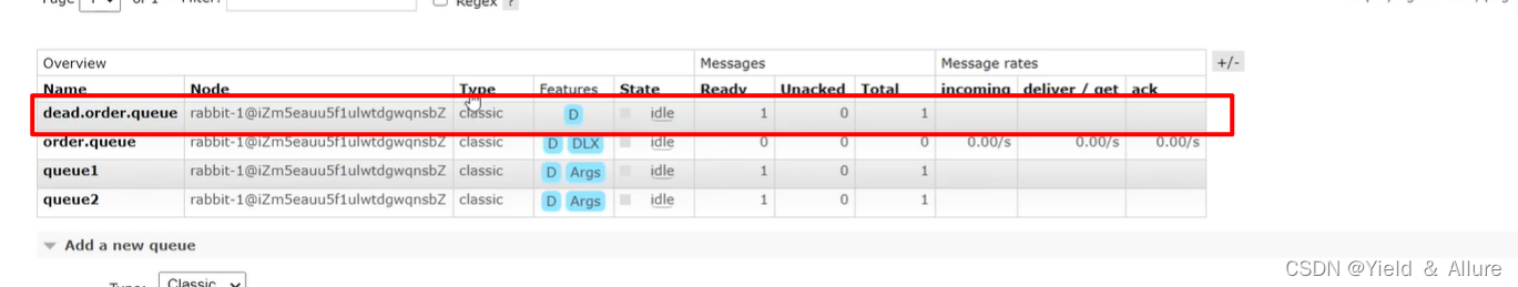 过了一会之后(此处时间是你配置rabbitmq刷新的时间,默认是5s)就会转移到dead.order.queue对列中,因为在服务端还是报错,rabbitmq就会把这条信息转移到死信队列里面存储