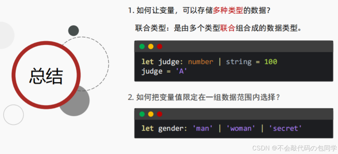 // 联合类型可以将变量值,约定在一组数据范围内进行选择