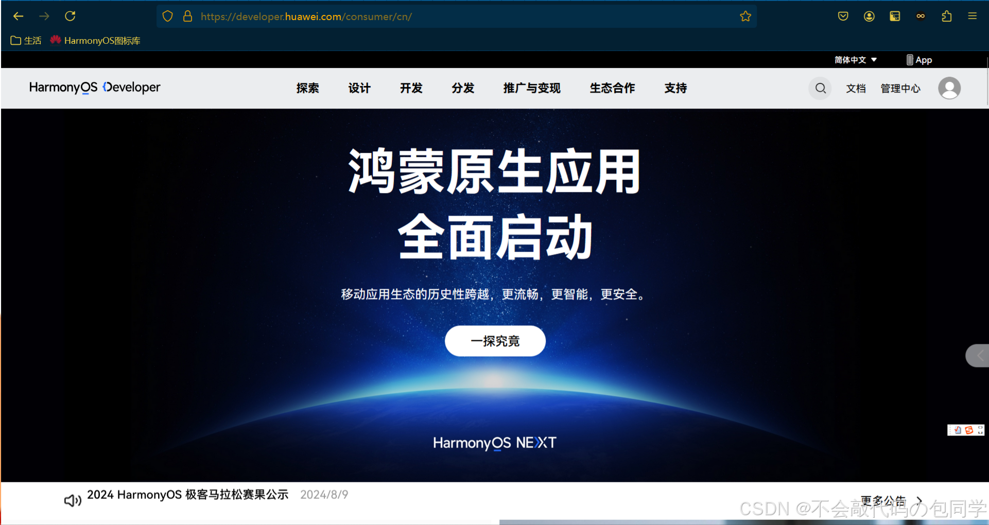 - 第一步:将HarmonyOS的官网地址复制粘贴进行搜索,或者也可以按住键盘Ctrl键点击下方链接进行跳转 华为开发者联盟-HarmonyOS开发者官网,共建鸿蒙生态 ,将会进入到HarmonyOS官网首页。