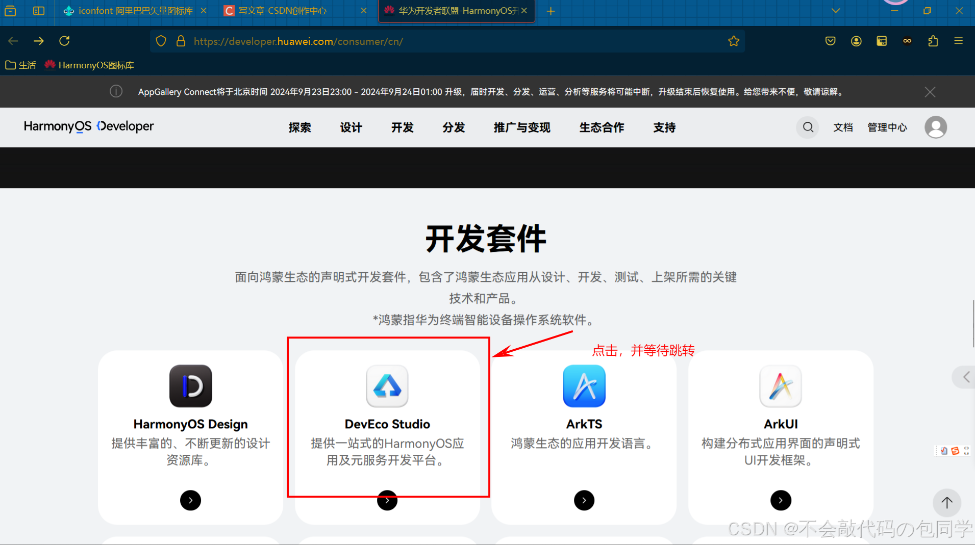 - 第二步:进入首页看到画面如下图所示,滚动网页直至找到DevEco Studio字样,并点击