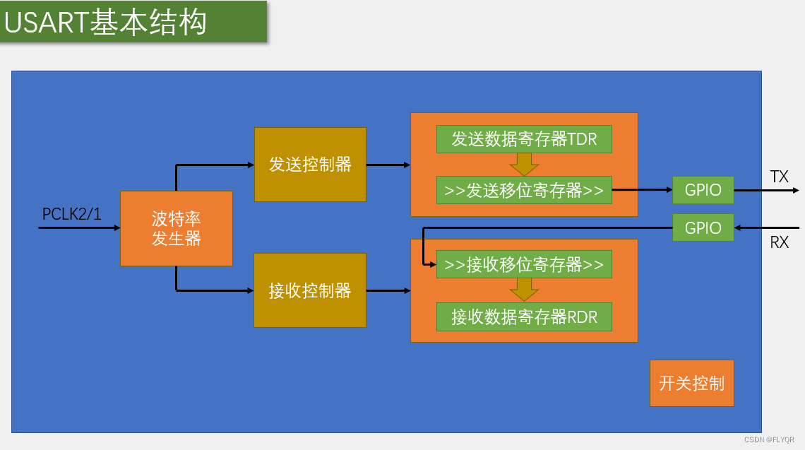 USART概念部分 发送移位寄存器—TX,RX—接收移位寄存器发送数据寄存器和接收数据寄存器占用同一个地址,在程序上只表现为一个寄存器,就是数据寄存器DR,实际硬件中分成两个,一个用于发送的TDR,一个用于接收的RDR,TDR只写,RDR只读当进行写操作时,数据就写到TDR,当进行读操作时,数据就从RDR读出发送移位寄存器,把数据一位一位的移出去,接收移位寄存器,把数据一位一位的读进来。