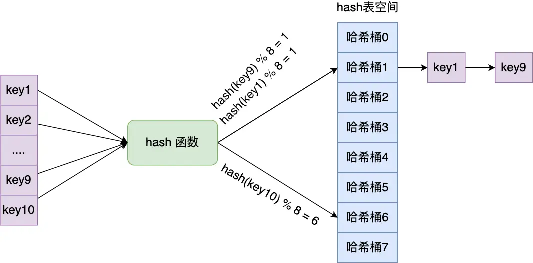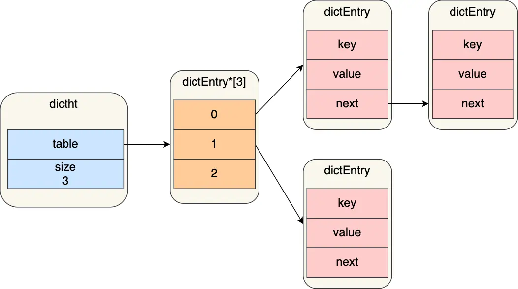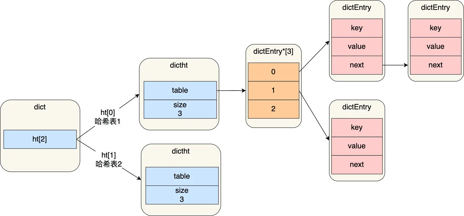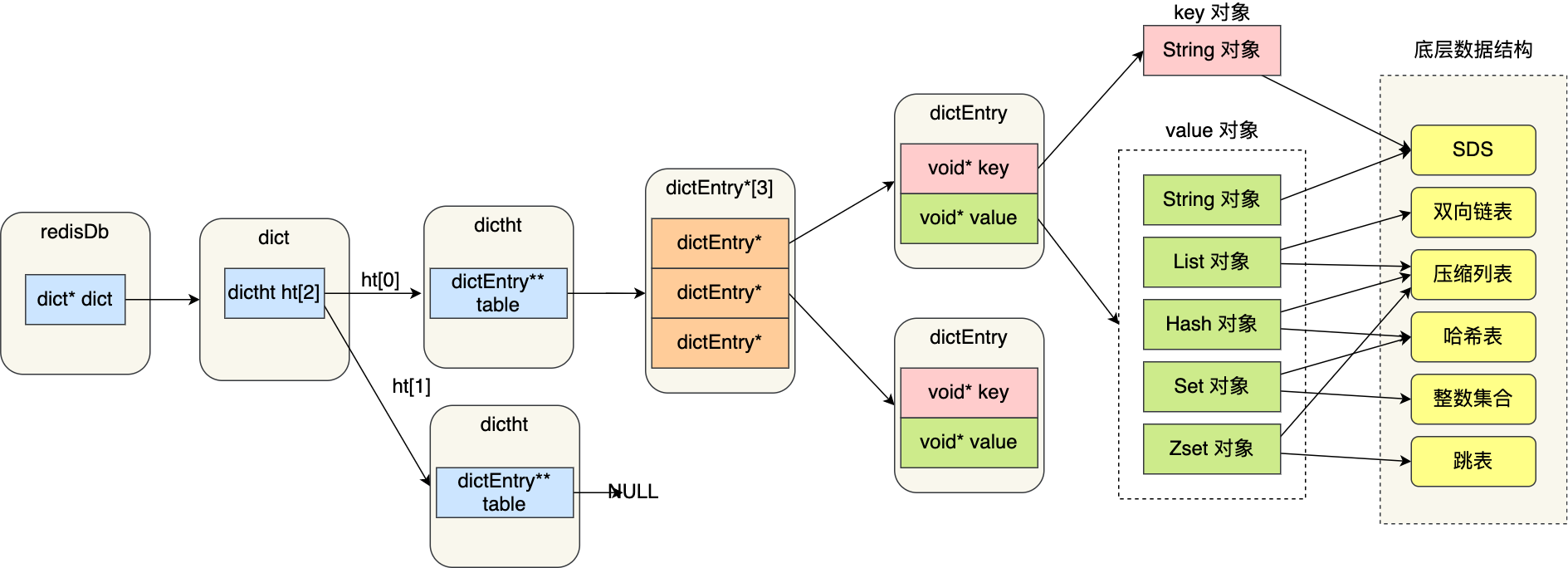 哈希桶存放的是指向键值对数据的指针,这些指针可以找到键值对数据,然后因为键值对的值可以保存字符串对象和集合数据类型的对象,所以键值对的数据结构中并不直接保存值本身。而是保存了指向键和值的指针,分别指向了实际的键对象和值对象,这样一来,即使是值是集数据,也可以通过值指针找到。