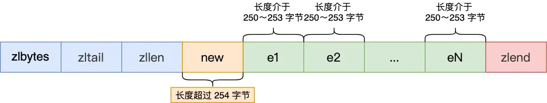 e1更新了之后,e1的长度也超过254了,那么e2也需要更新,以此类推,直到为尾节点中间的所有节点都需要更新。这也就是连锁更新。