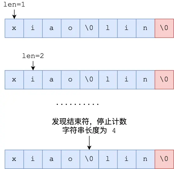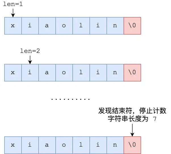 举个例子,C 语言获取字符串长度的函数 strlen,就是通过字符数组中的每一个字符,并进行计数,等遇到字符为 “\0” 后,就会停止遍历,然后返回已经统计到的字符个数,即为字符串长度。下图显示了 strlen 函数的执行流程: