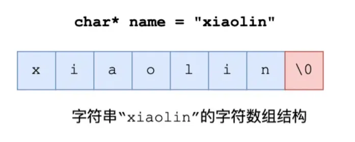比如下图就是字符串 “xiaoxin”的 char* 字符数组的结构: