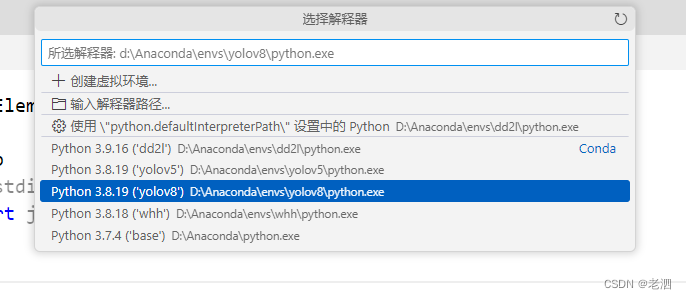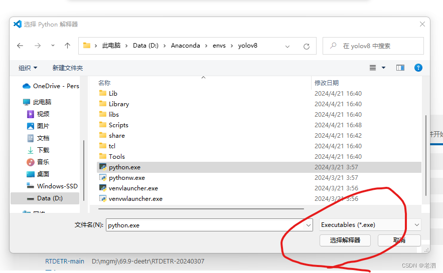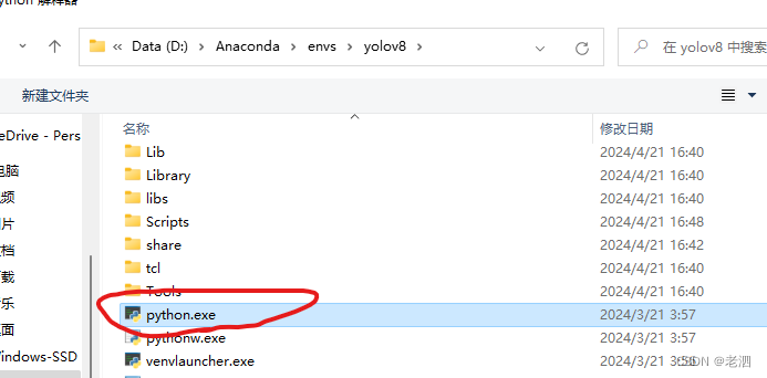 比如我要找我的一个名为yolov8的,就是在环境的文件夹里最下面的python.exe