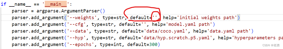 第一个是weights ,表示的是预训练权重,这这个东西好比说是让现在训练的模型有一些训练的经验,这样会使得训练精度有一定的提升,但是不一定说一定比没有预训练权重的好,一般来说都要好一些,这个是需要下载预训练权重的,这个东西在github下载的时候那里可以下载,
