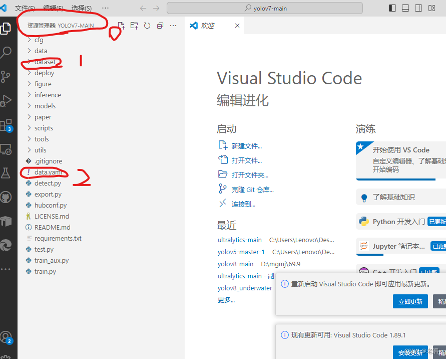 首先就是数据集 , 我之前写的划分数据集的那个文件夹,还有data.yaml文件要设置好,然后将这两个文件放在项目文件夹下面,注意放的位置