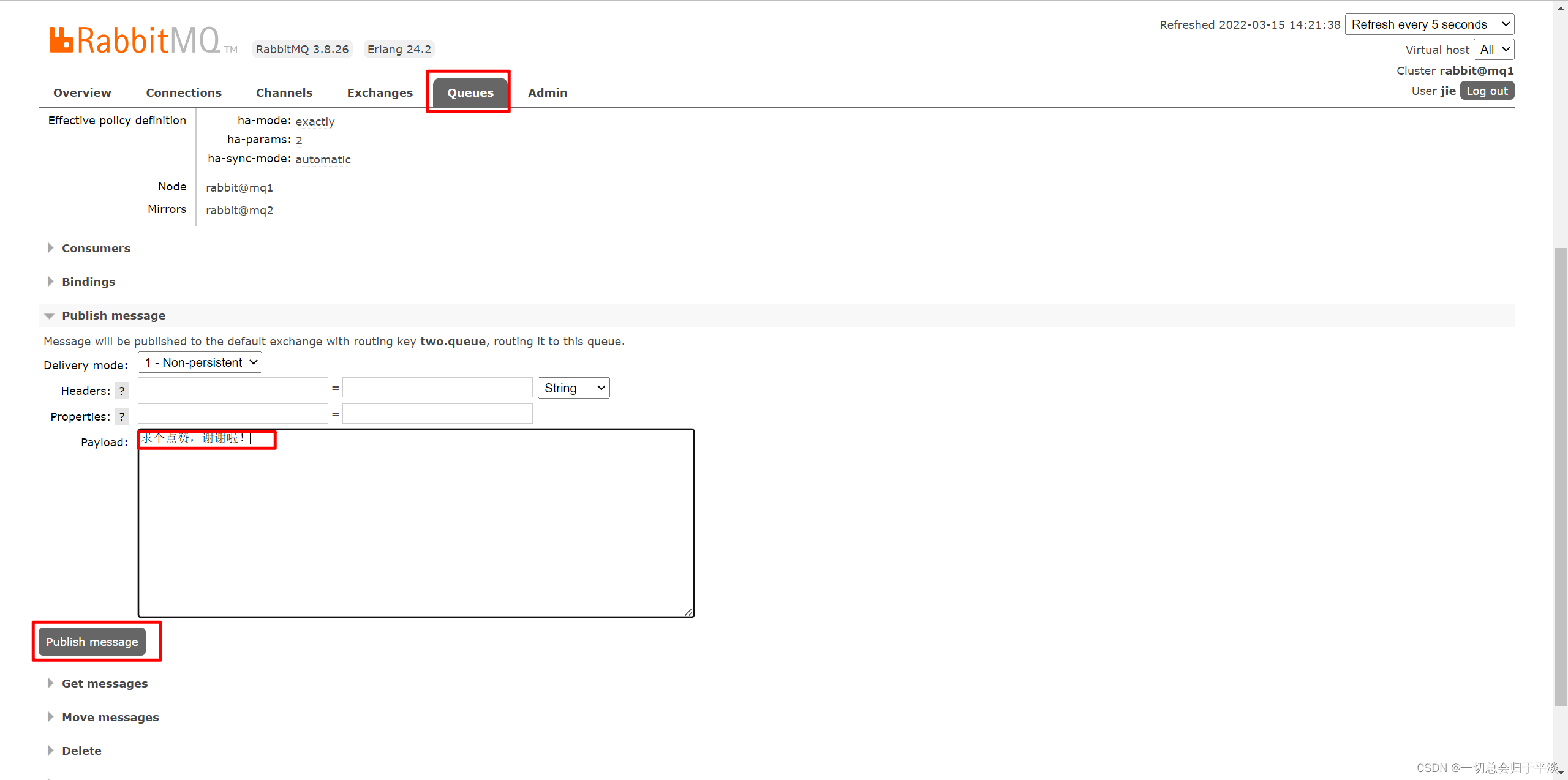 "ha-params":["rabbit@mq1", "rabbit@mq2"]:策略参数,这里指定副本所在节点名称