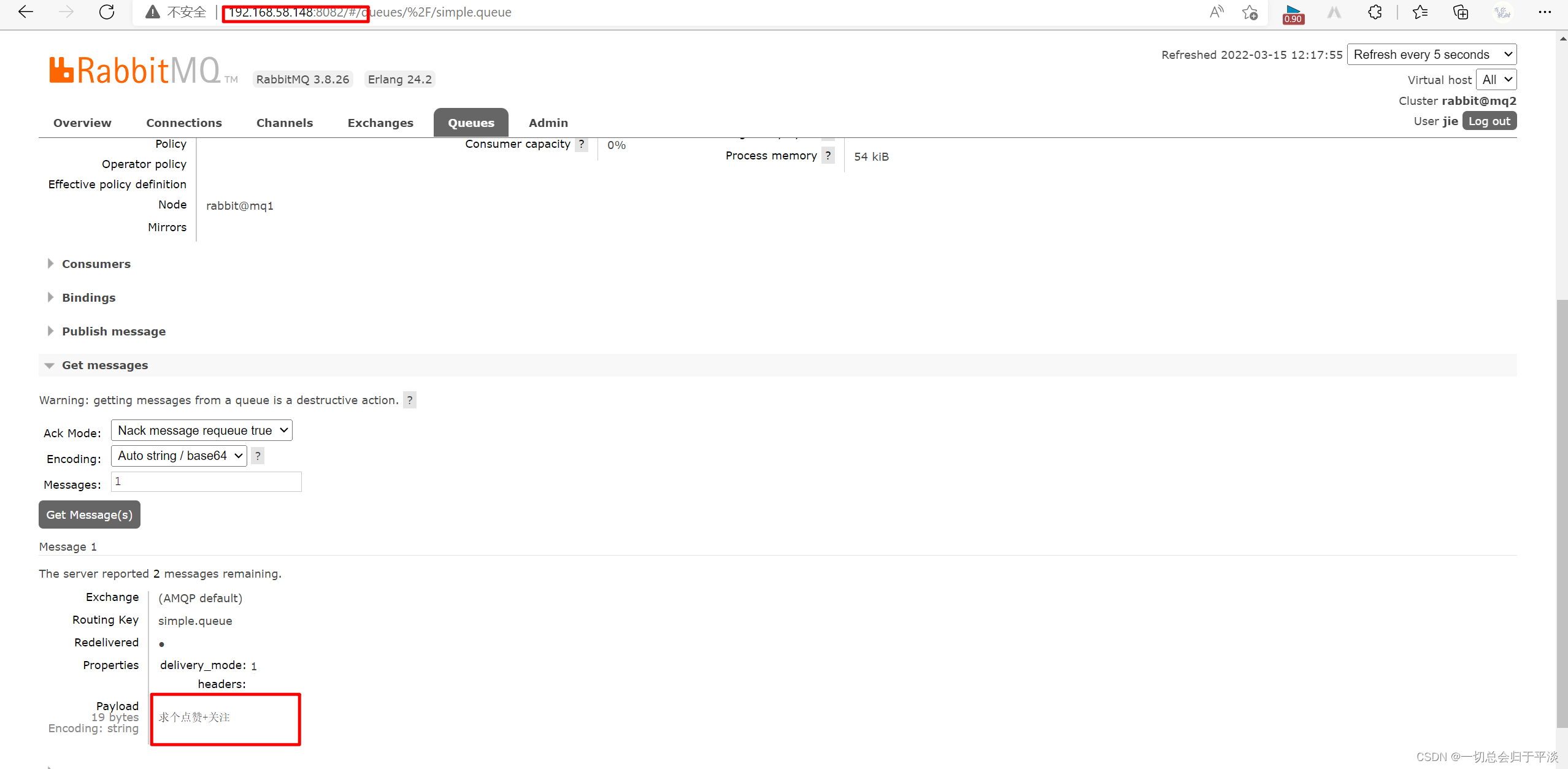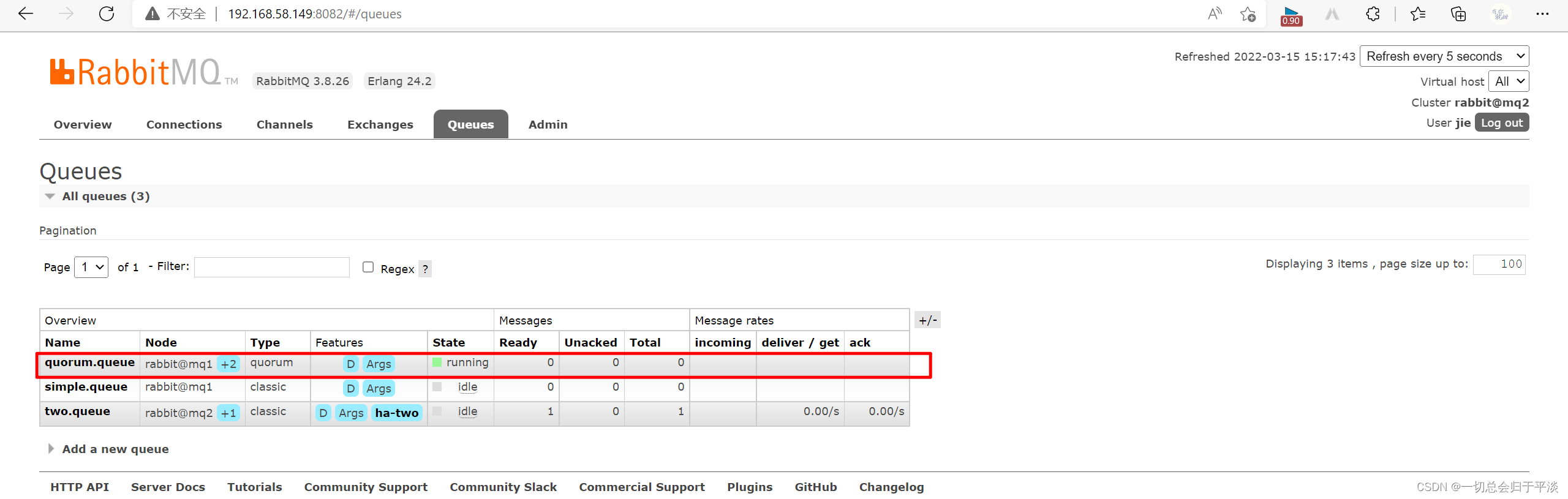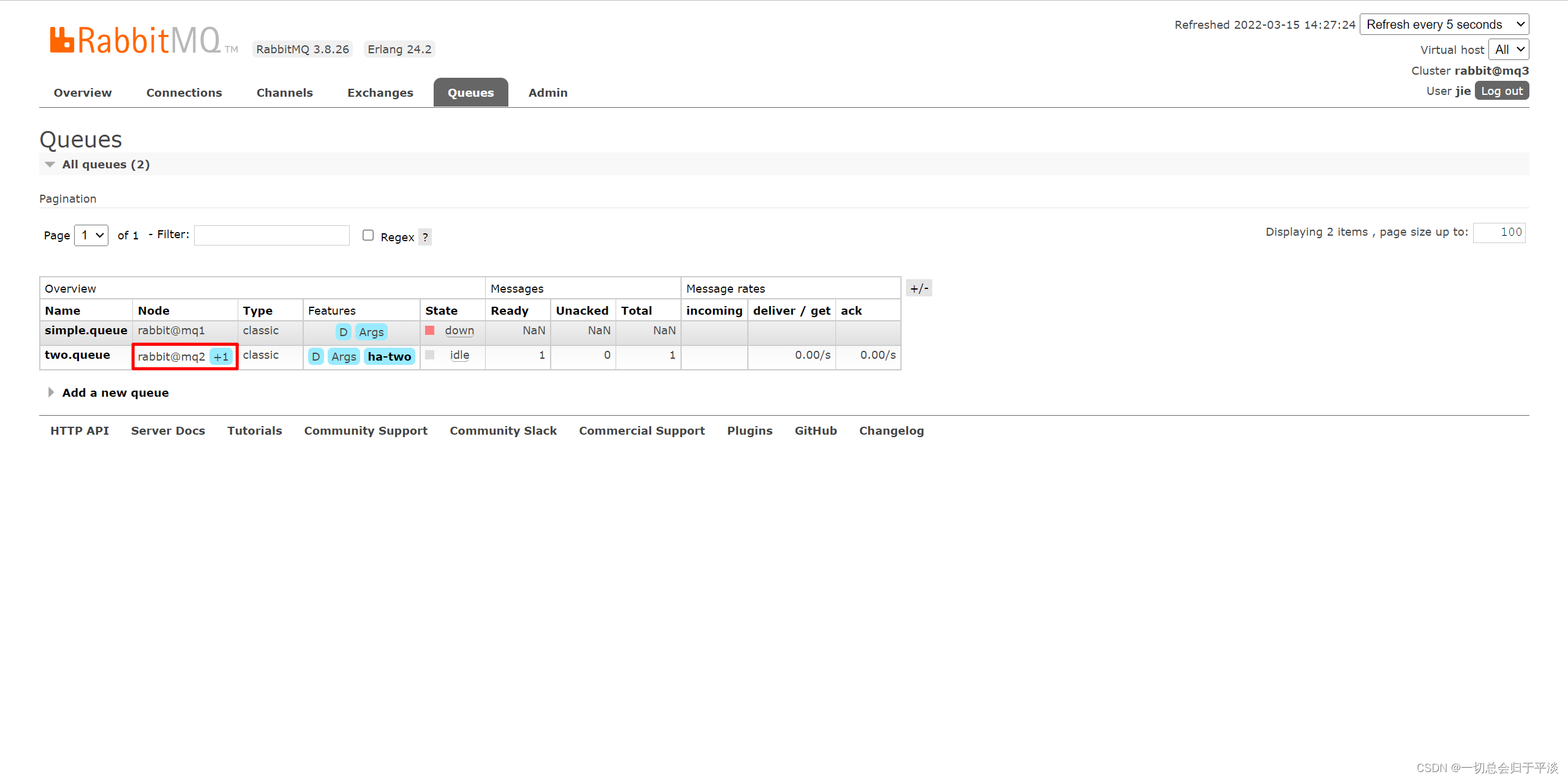 可以看到,仲裁队列的 + 2字样。代表这个队列有2个镜像节点。