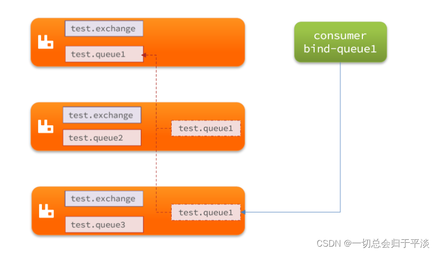 当访问集群某节点时,如果队列不在该节点,会从数据所在节点传递到当前节点并返回