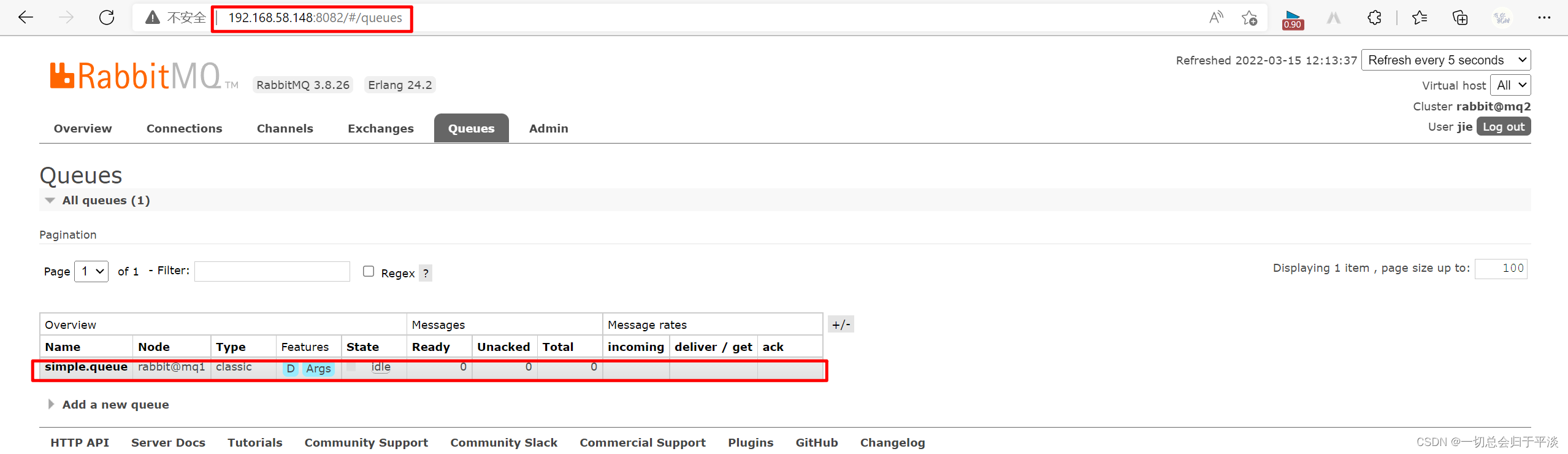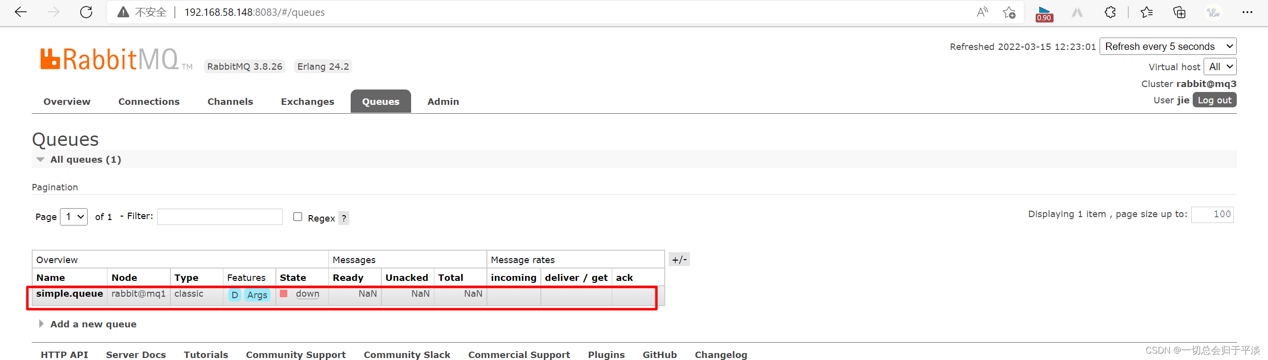 然后登录mq2或mq3的控制台,发现simple.queue也不可用了: