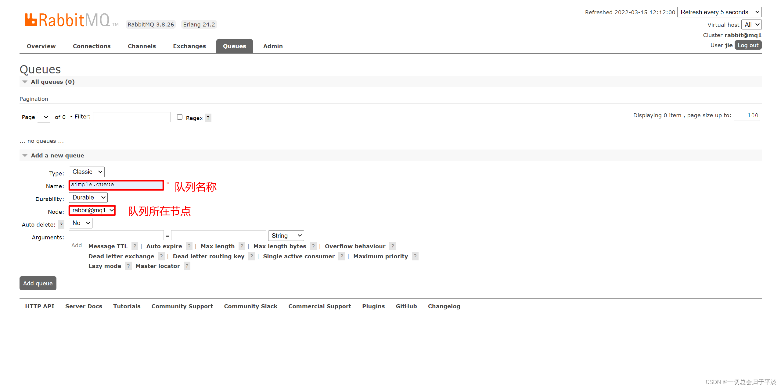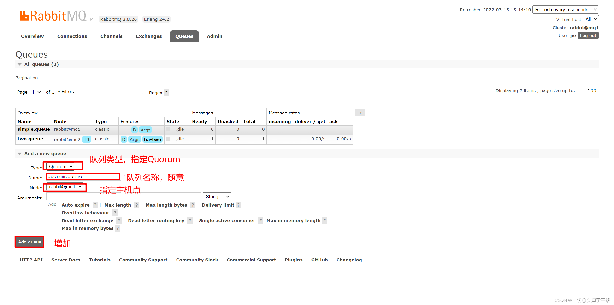 在任意控制台添加一个队列,一定要选择队列类型为Quorum类型。