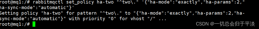 rabbitmqctl set_policy ha-two "^two\." '{"ha-mode":"exactly","ha-params":2,"ha-sync-mode":"automatic"}'
