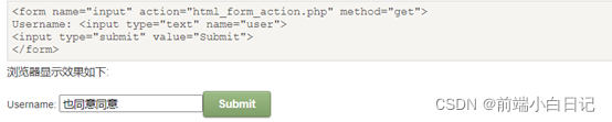 当用户单击确认按钮时,表单的内容会被传送到另一个文件。表单的动作属性定义了目的文件的文件名。由动作属性定义的这个文件通常会对接收到的输入数据进行相关的处理。