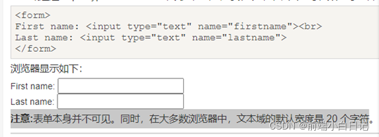 注意:表单本身并不可见。同时,在大多数浏览器中,文本域的默认宽度是 20 个字符