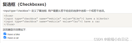 <input type="checkbox"> 定义了复选框. 用户需要从若干给定的选择中选取一个或若干选项。