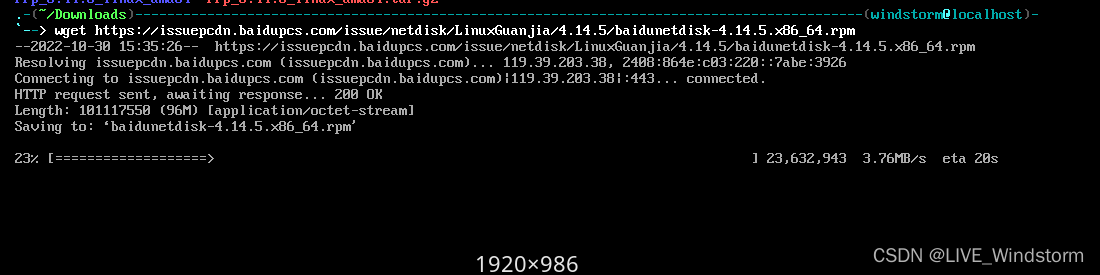 命令:wget https://issuepcdn.baidupcs.com/issue/netdisk/LinuxGuanjia/4.14.5/baidunetdisk-4.14.5.x86_64.rpm