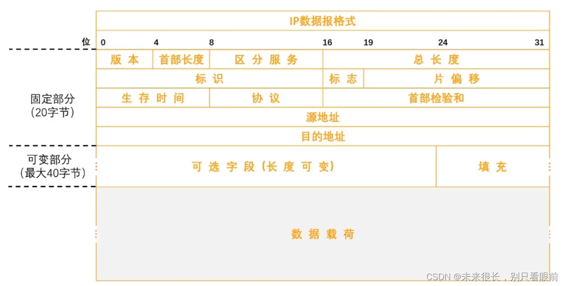 总长度:占16比特,表示IP数据报的总长度【首部+数据载荷】,最大取值为十进制65535,以字节为单位。