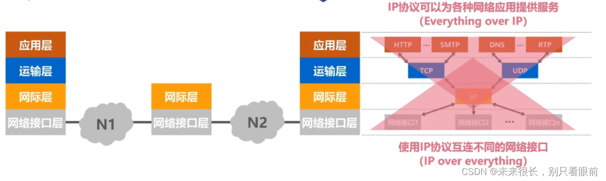 IP协议可以将不同的网络接口进行互连,并向其上的TCP协议和UDP协议提供网络互连服务。而TCP协议在享受IP协议提供网络互连服务的基础上,可向引用层的相应协议提供可靠传输服务,UDP在享受IP协议提供网络互连服务的基础上,可向应用层的协议提供不可靠的传输服务; IP协议作为TCP/IP体系结构中的核心协议,一方面负责互连不同的网络接口,另一方面,为各种网络应用提供服务。 TCP/IP协议体系中包含了大量的协议,IP协议和TCP协议是其中非常重要的两个协议,因此用TCP和IP来表示整个协议大家族。