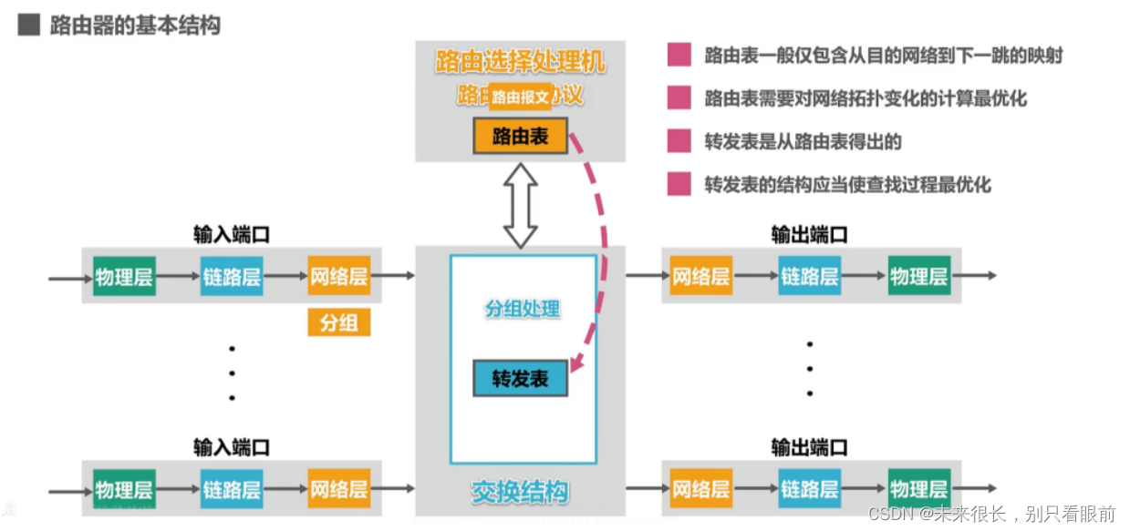 路由器的基本结构:路由器是一种具有多个输入端口和输出端口的专用计算机,其任务是负责转发分组。