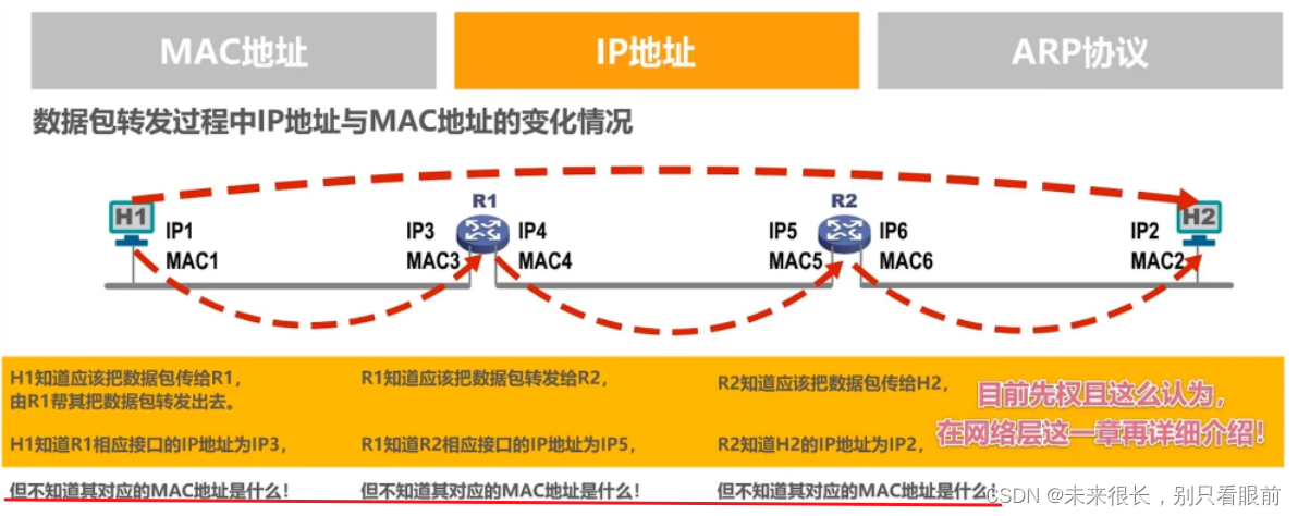 为了将重点放在TCP/IP协议栈的网际层发送和转发IP数据包的过程上,在之后的举例中,我们忽略使用ARP协议来获取目的主机或路由器接口的MAC地址的过程,以及以太网交换机自学习和转发帧的过程。