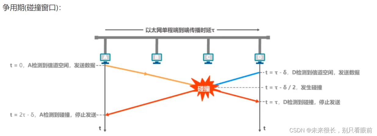 主机在发生数据时,应该给数据附加上目的地址,当其他主机收到后,根据目的地址和自身地址来决定是否接受数据,这就又引出了一个问题,目的主机如何从信号所表示的一连串比特流中区分地址和数据?也就是说要解决分组的封装格式问题;另外对于总线型网络还会出现下面的问题,例如某个时刻总线是空闲的,也就是说没有主机来使用总线发送数据,片刻之后主机B和D同时向总线发送数据,这会导致信号碰撞,因此如何协调各主机争用总线,也是必须要解决的问题;