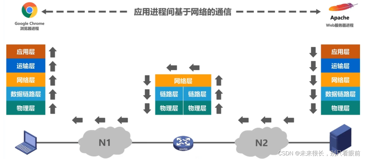 至此,我们解决了物理层,数据链路层以及网络层各自的问题,则可以实现分组在网络间传输的问题。但是这对于计算机网络的应用来说仍然不够,例如假设这台主机中运行着两个与网络通信相关的应用进程,一个是浏览器进程,另一个是QQ进程,这台服务器中运行者与网络通信相关的服务进程。某个时刻主机收到了来自服务器的分组,那么这些分组是应该交给浏览器进程处理呢?还是应该交给QQ进程处理?这就引出了我们如何标识与网络通信相关的应用进程,进而解决进程之间基于网络的通信问题。