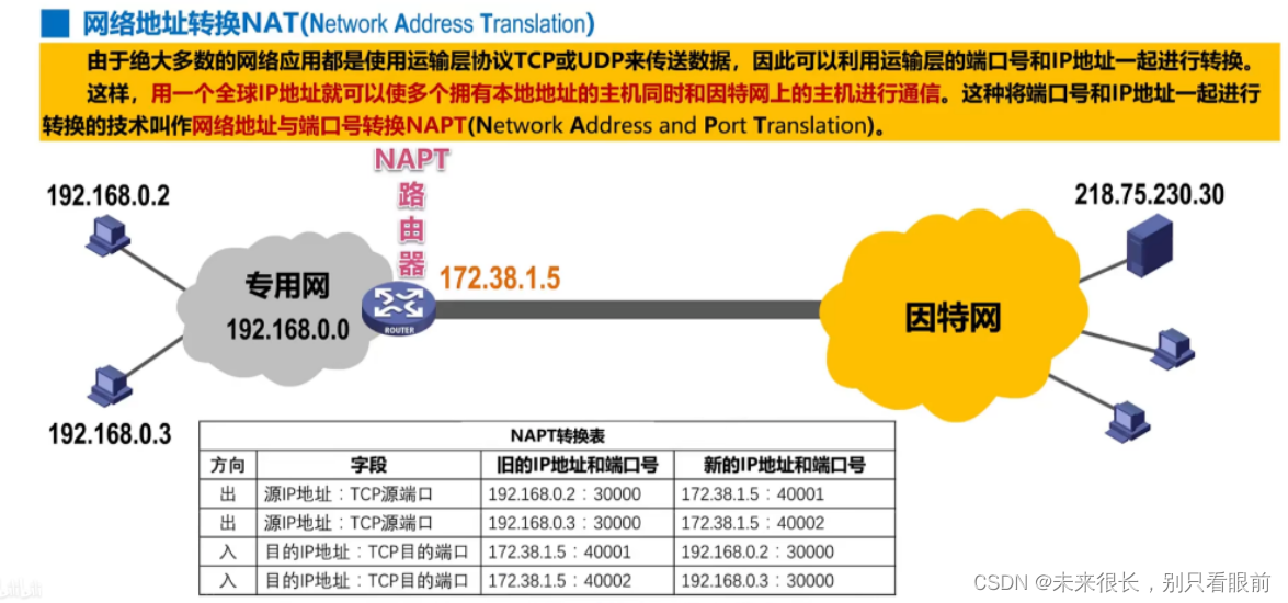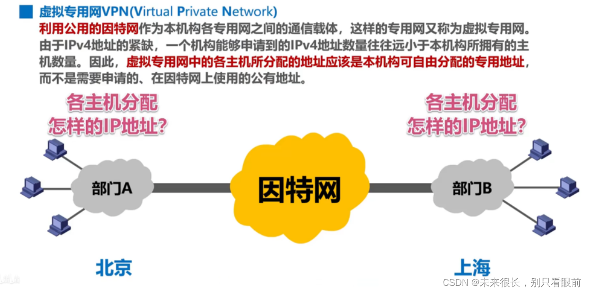 需要注意的是:私有地址只能用于一个机构的内部通信,而不能用于因特网上的主机通信。换句话说,私有弟子只能用作本地地址,而不能用作全球地址。在因特网中的所有路由器,对目的地址是私有地址的,IP数据报一律不进行转发。