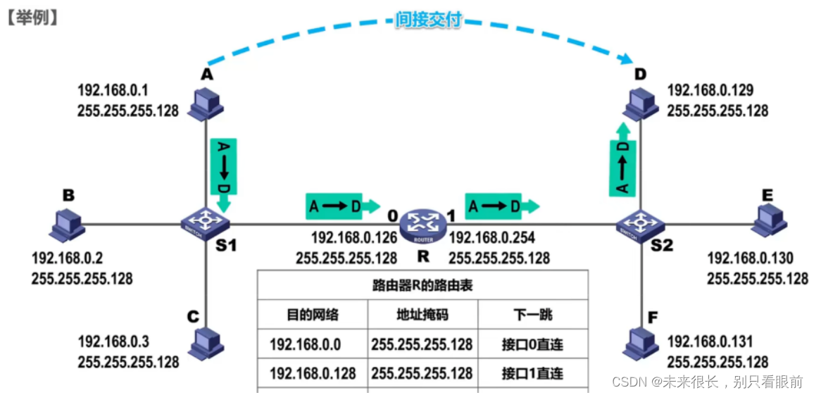 假设本力中的主机A要给主机D发送数据报,这属于间接交付。主机A会将该IP数据报传输给自己的默认网关,也就是图中所示的路由器。【那么路由器接收到IP数据报之后又是如何进行转发的呢?】