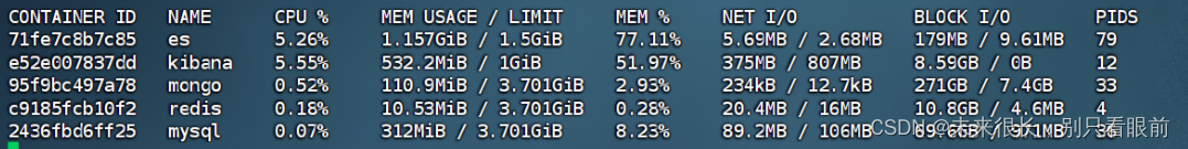 如果安装了docker,想看docker中的容器使用内存和cpu的情况,可以使用下面的指令进行查看: