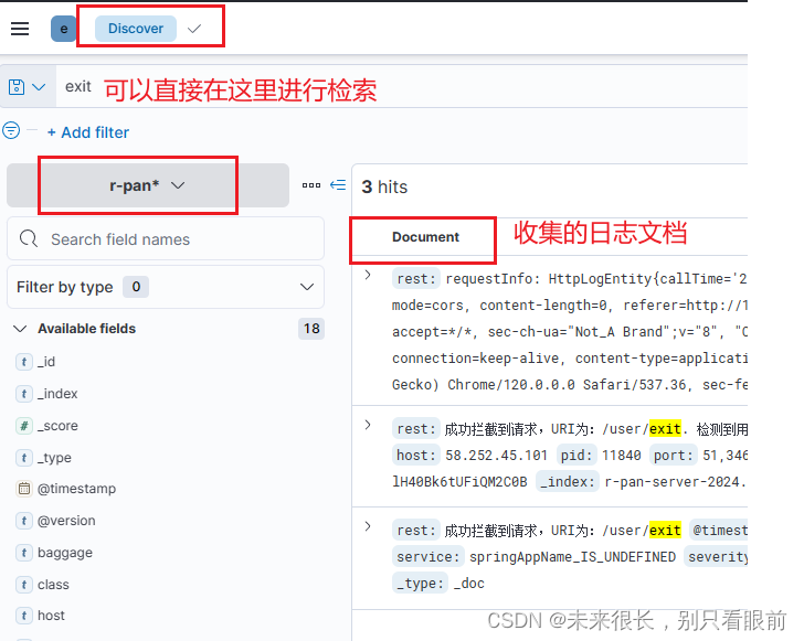 创建完成索引匹配模式之后,就可以去查看收集的日志信息了: