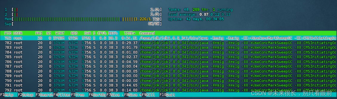 如果服务器中的程序的运行没有在docker中运行,我们先查看云服务器中程序使用内存的情况,可以使用htop插件来查看内存使用情况:先安装top